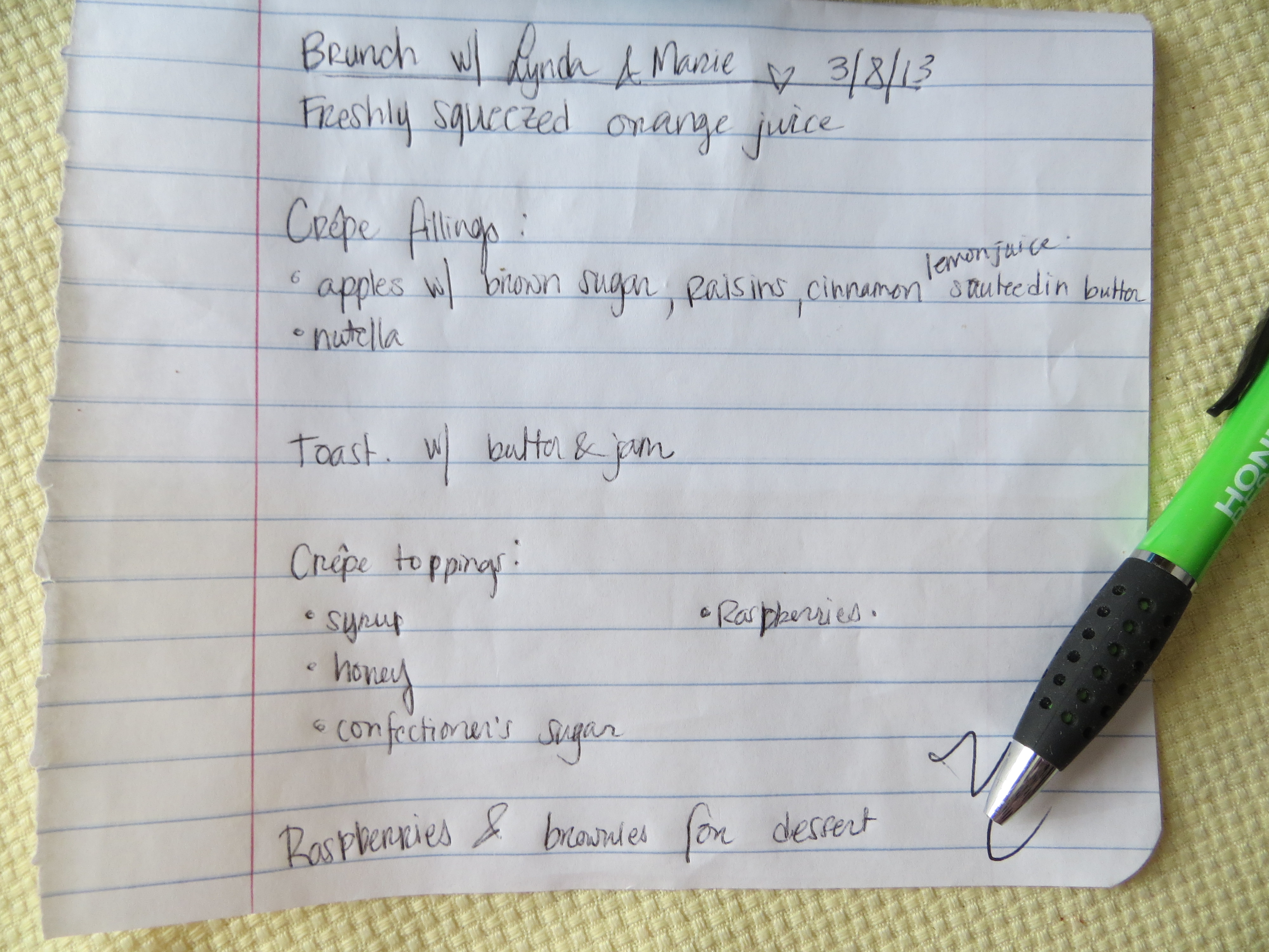 I checked my phone and saw a text from my friend saying, “Love you babe but I’m gonna have to cancel lunch. The snow looks like its gotten pretty bad.” Not to be dramatic or anything, but my heart was shattered. Who was I going to share my first ever batch of crepes with?? I shamelessly sent her a picture of the freshly squeezed orange juice, and we were back on for lunch. She would be on her way in an hour, so I headed down to the kitchen, heated up the skillet, and poured some batter!