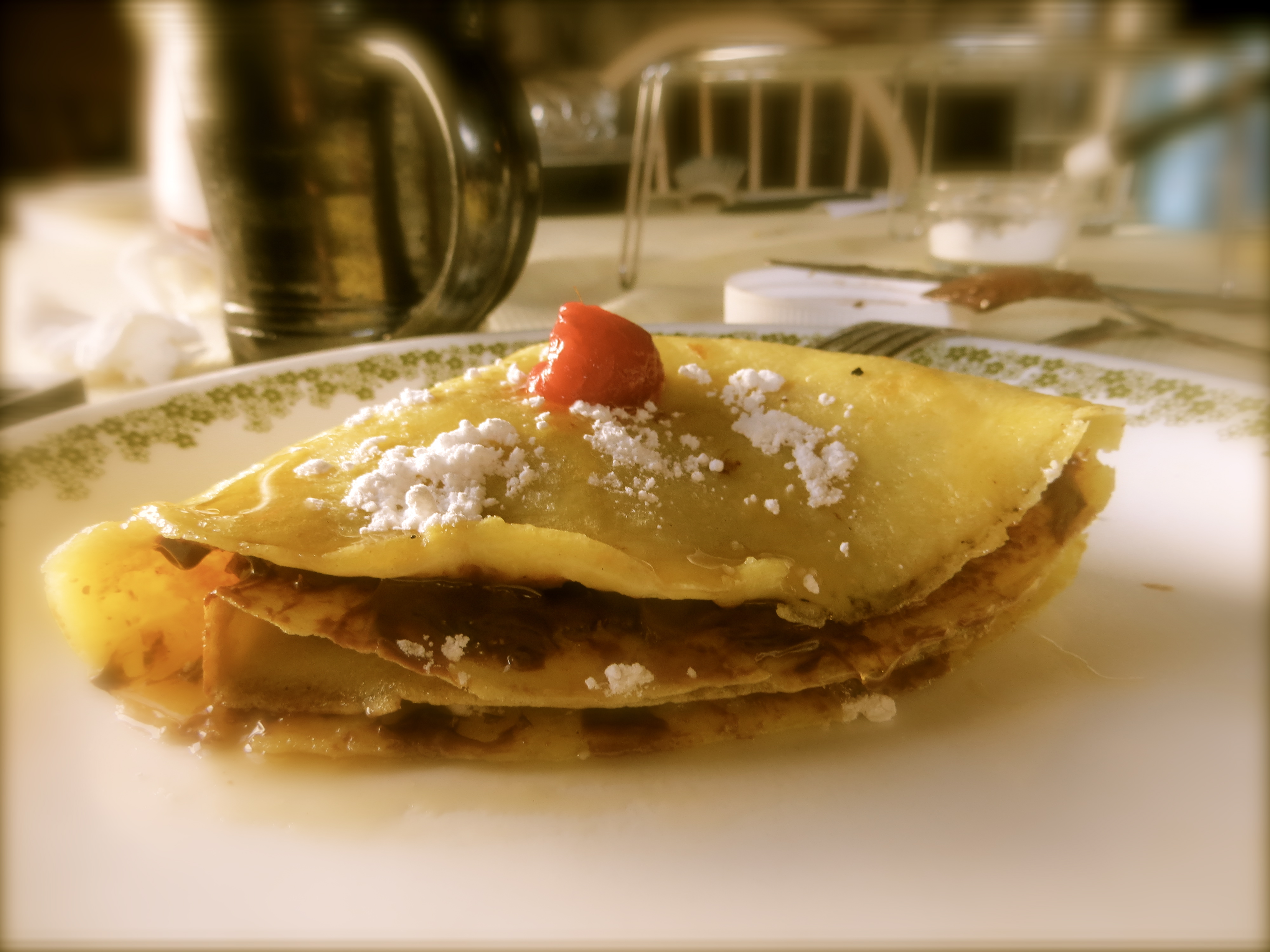 Upon returning from Paris, I had been dreaming about making crepes for breakfast. The funny thing about crepes is that they’re a total tourist gimmick. Street vendors and restaurants in Western Europe may serve sweet crepes (crepes sucrees), but according to a restaurant owner I met in Roma, no locals eat them; they’re too fattening. And from the looks of the French and Italians’ shapely figures, I completely believe that they’re not eating crepes for lunch. Leave it up to us Americans to find any excuse to indulge in the calorie-infused faux ‘local cuisine.’ Even after learning this, I didn’t care. I ate crepes outside of le Lourve, at the bottom of le Sacre Coeur, and even in the Vatican Museum where they had an entire Nutella crepe-making stand: