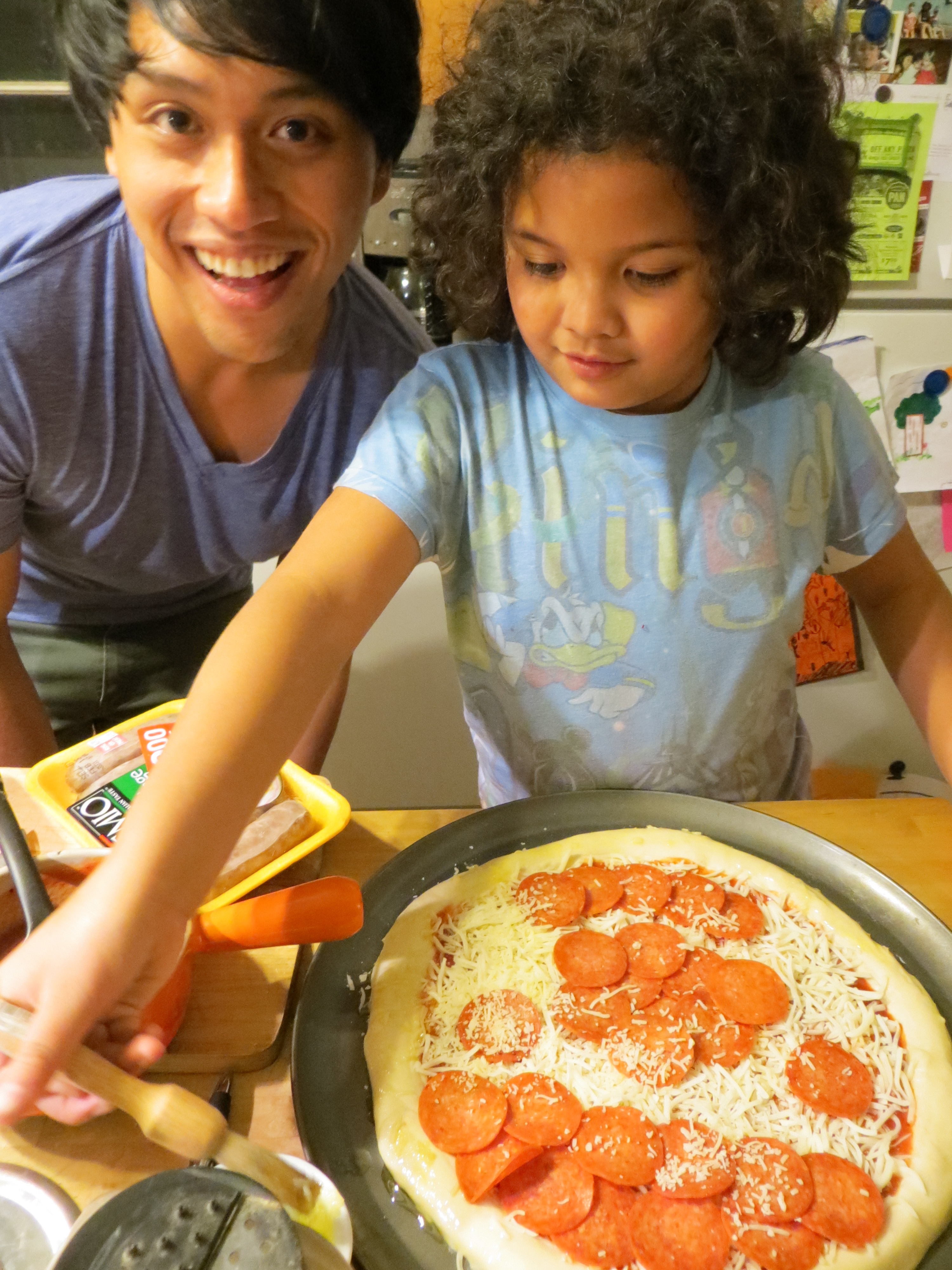 When we got back to the house, we cooked up a very kid-friendly, anti-veggie dinner to feed my four “baby” cousins. They were so eager to help us in the kitchen. They helped Shaun decorate his infamous pepperoni-sausage pizza and helped me fry some chicken fingers. My tita told my cousin that I was making chicken fingers with real chicken breast, and my cousin was confused — “Chicken fingers aren’t usually made with real chicken?” (recipe below)
