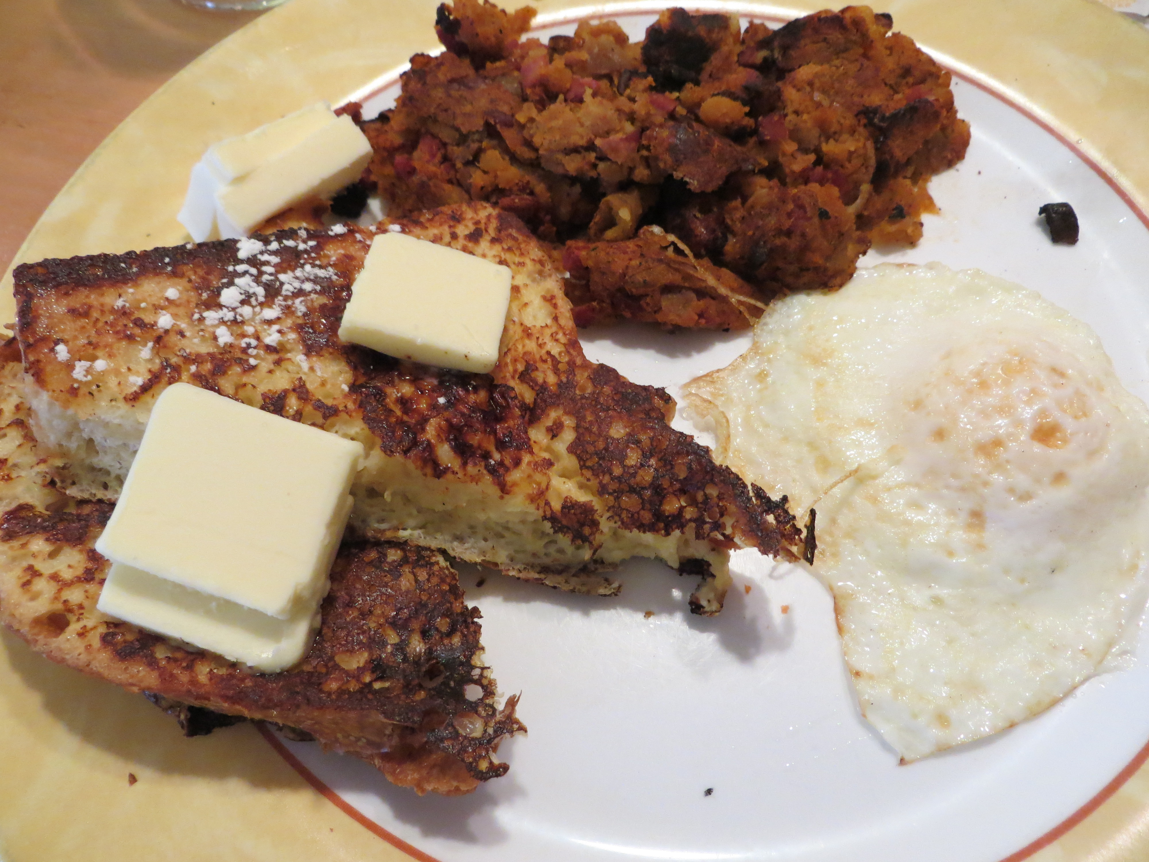 Challah French Toast ($6.75) w/ corned beef hash and an egg over-easy