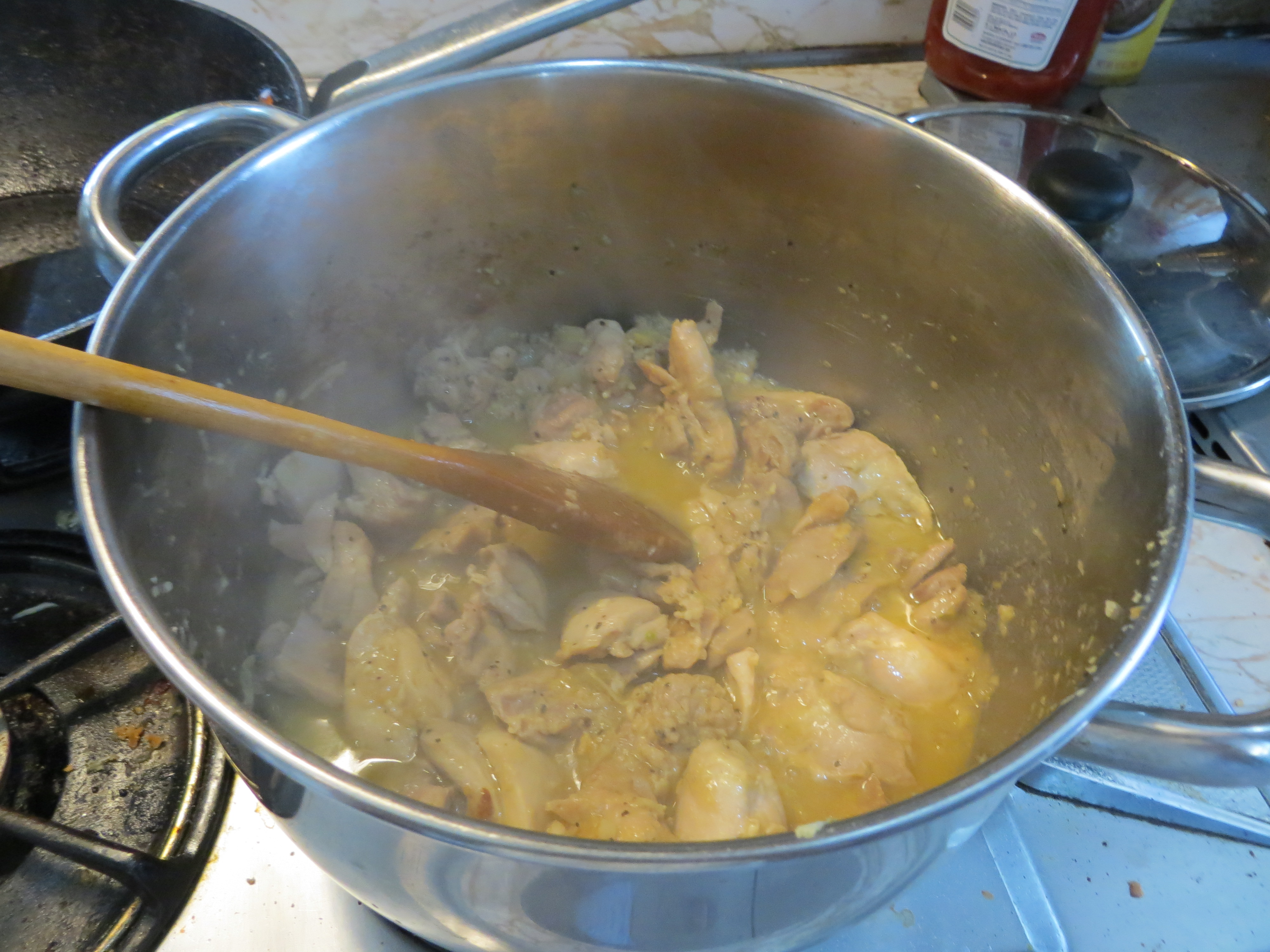 3. Cover and simmer until chicken is almost completely cooked. (7-10 mins). At this point, the juices from the chicken will be coming out — the base for the broth.