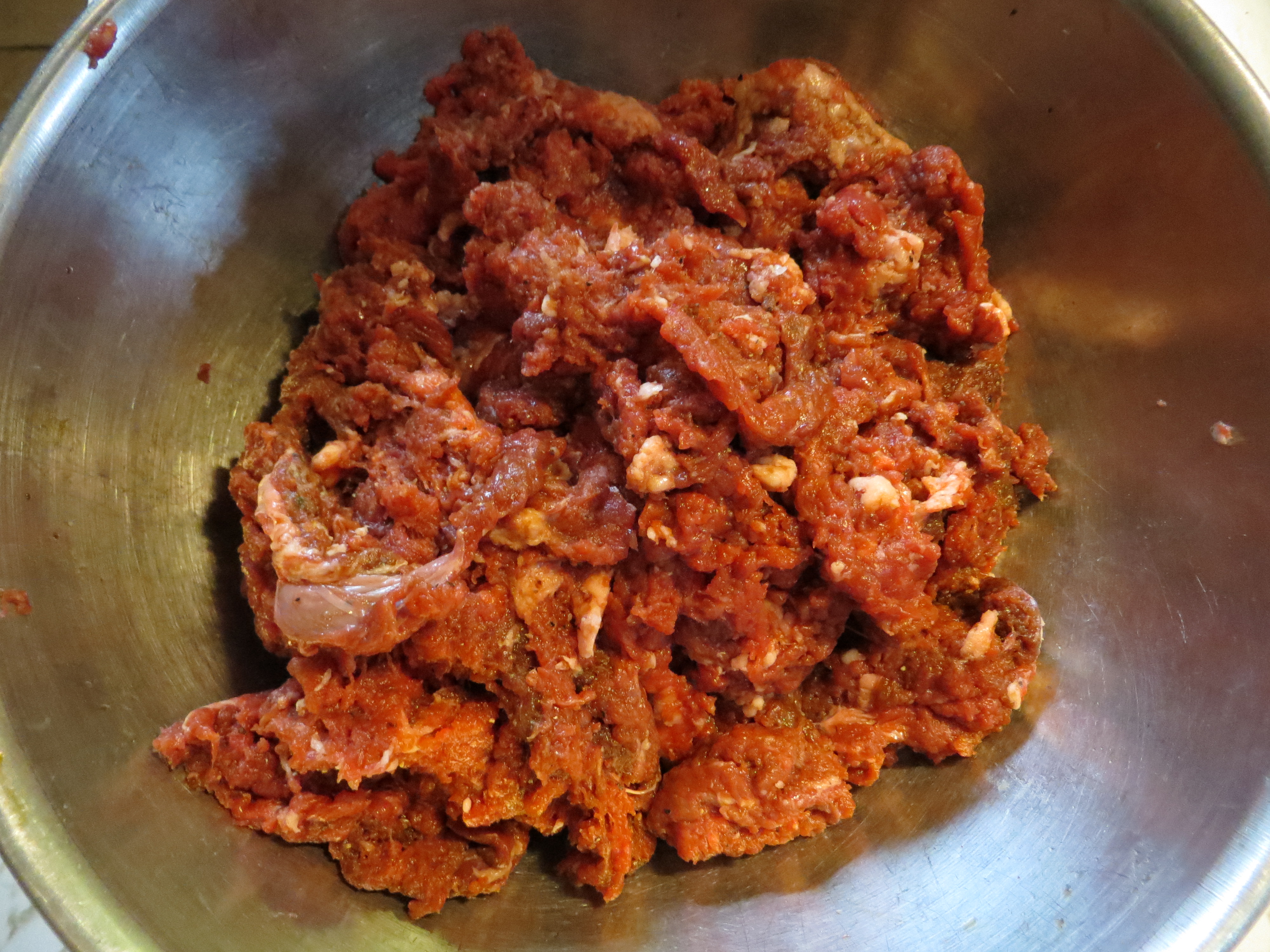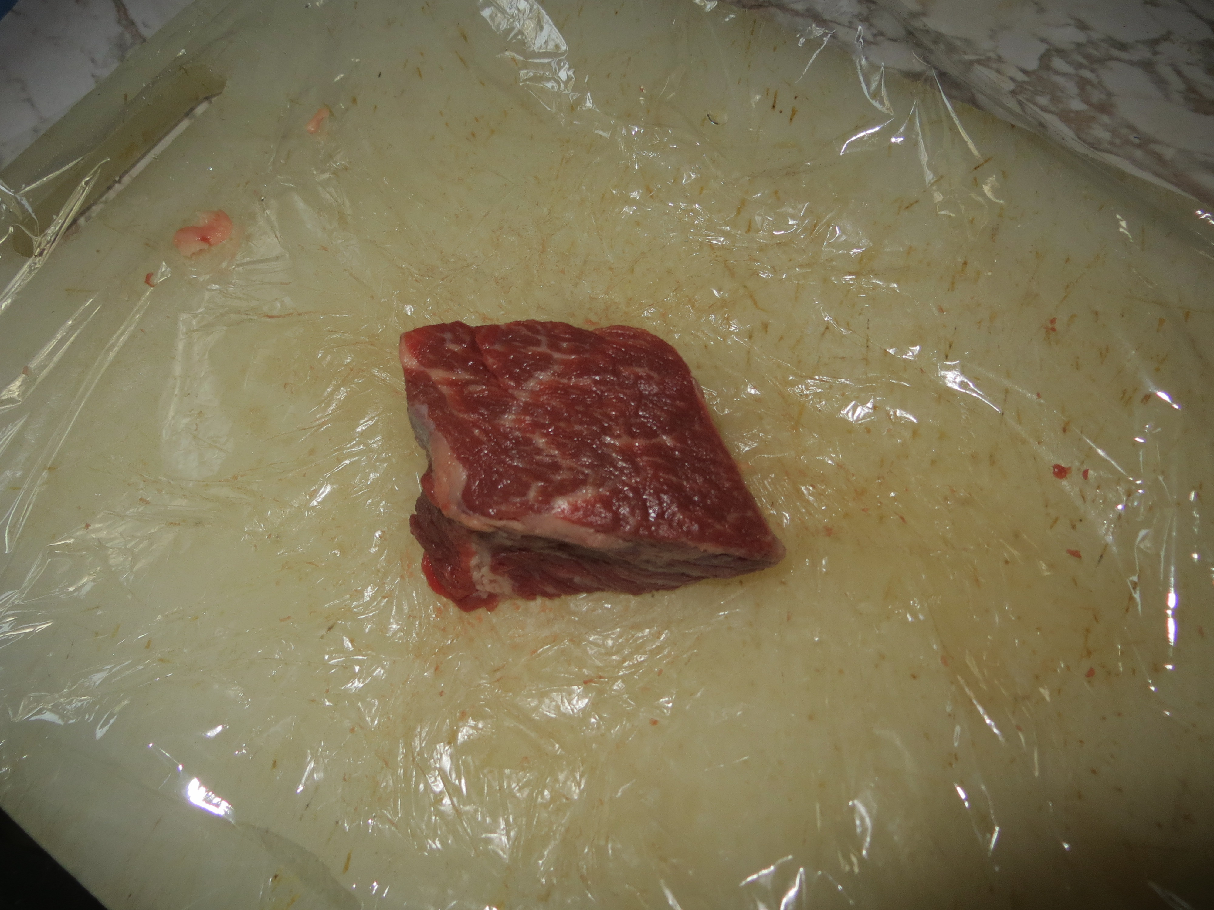 Cut beef into 2 1/2 inch cubes. Cover a chopping board with plastic wrap, and place beef cube in center. Lay another sheet of plastic wrap over the beef. Pound with tenderizer until beef is about a quarter of an inch thick and expanded throughout the surface of the chopping board. Beef should be able to be ripped apart when you remove it from the chopping board. Transfer to marinade (recipe follows).