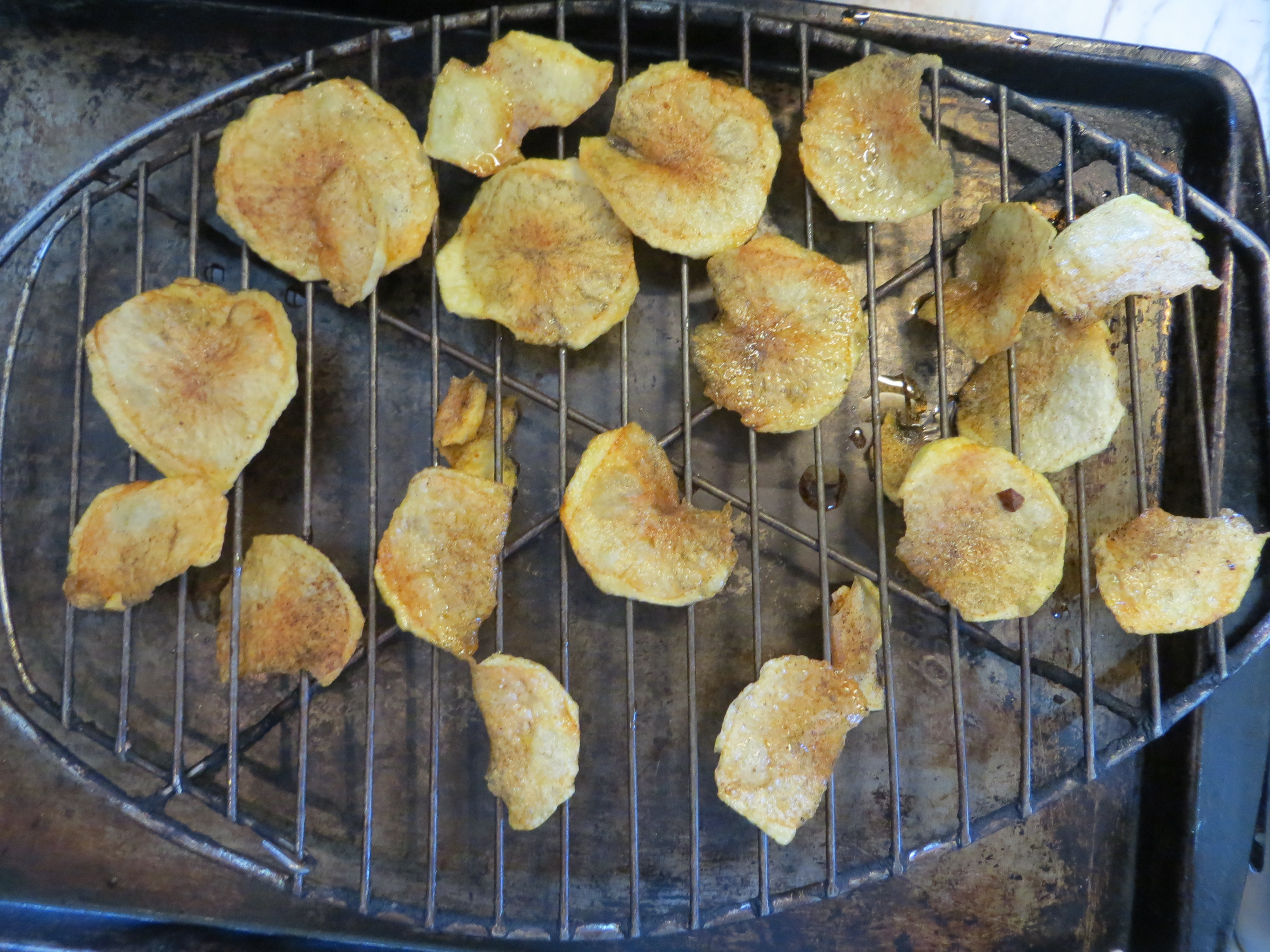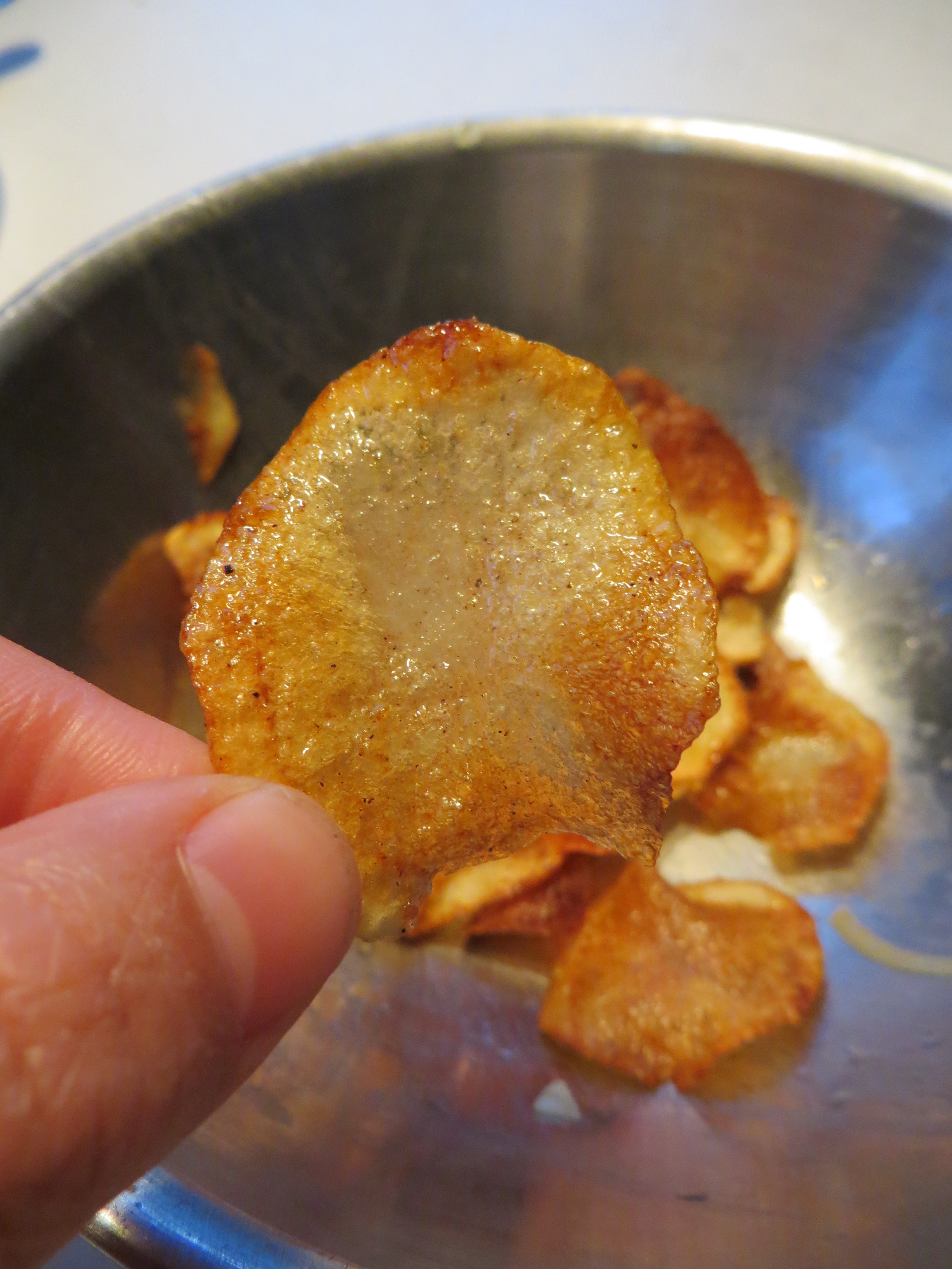 In a deep frying pan, heat oil. Slice potato very thinly with a mandoline slicer. (I don’t have one, so I used a cheese grater. 🙂 ) Fry slices for about 3 minutes on each side, until light brown. Cool for 2 minutes on a cooling rack placed over a baking sheet in order to catch the excess oil. Transfer to a large bowl and toss with salt and apple cider vinegar*.