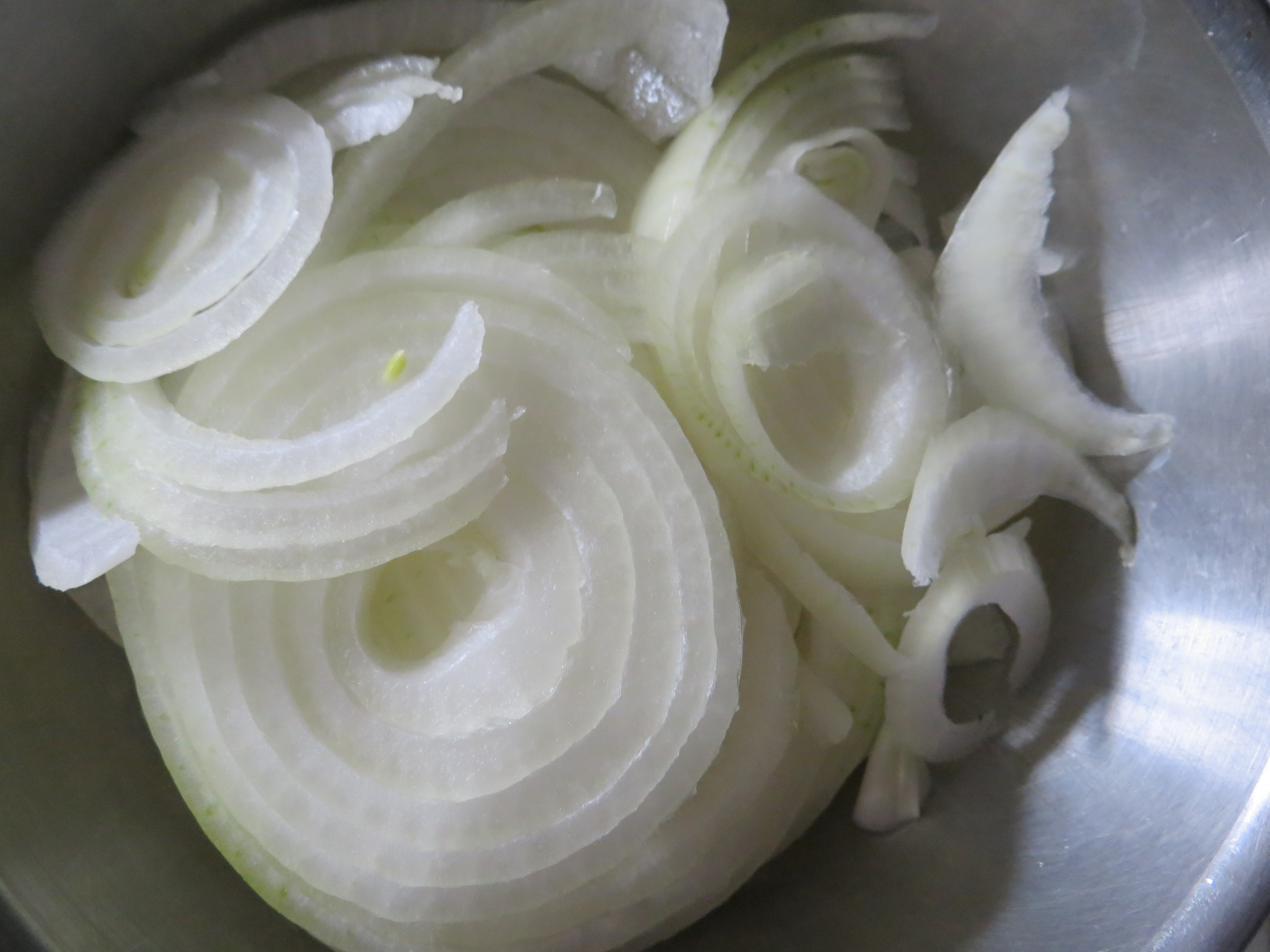 Filipino beefsteak is a mouthwatering sweet beef stew served with rice and pairs excellent with some kind of potato side. The secret? The tenderness of the beef! The perfect sauce could be completely offset by tough, hard-to-slice-with-just-your-spoon-and-fork kind of beef. Therefore, the right hardware and technique for tenderizing the beef is key. You need a good meat tenderizer. For years, maybe decades, the thinner tenderize (pictured below) was what I, and presumably my mother, would use. It’s a tedious process, to say the least. All in all, I’d say beefsteak should take only 20-25 minutes to make, but tenderizing three pounds of meat with that thing added on, I kid you not, forty extra minutes at least. It would also create blisters because of the thin structure of the handle. When my boyfriend and I started dating, he took on the role as my official beefsteak tenderizor. He would pound away, but still felt the same burden I would experience. So, for this special post on beefsteak, he treated himself to a brand spankin’ new tenderizer. It was one of the more pricey ones at $12, but the weight was distributed perfectly, and there was a rubber handle with a sturdy design. It cut our tenderizing time to just 10 minutes. Well worth the long-term investment. 🙂 Read on for technique…