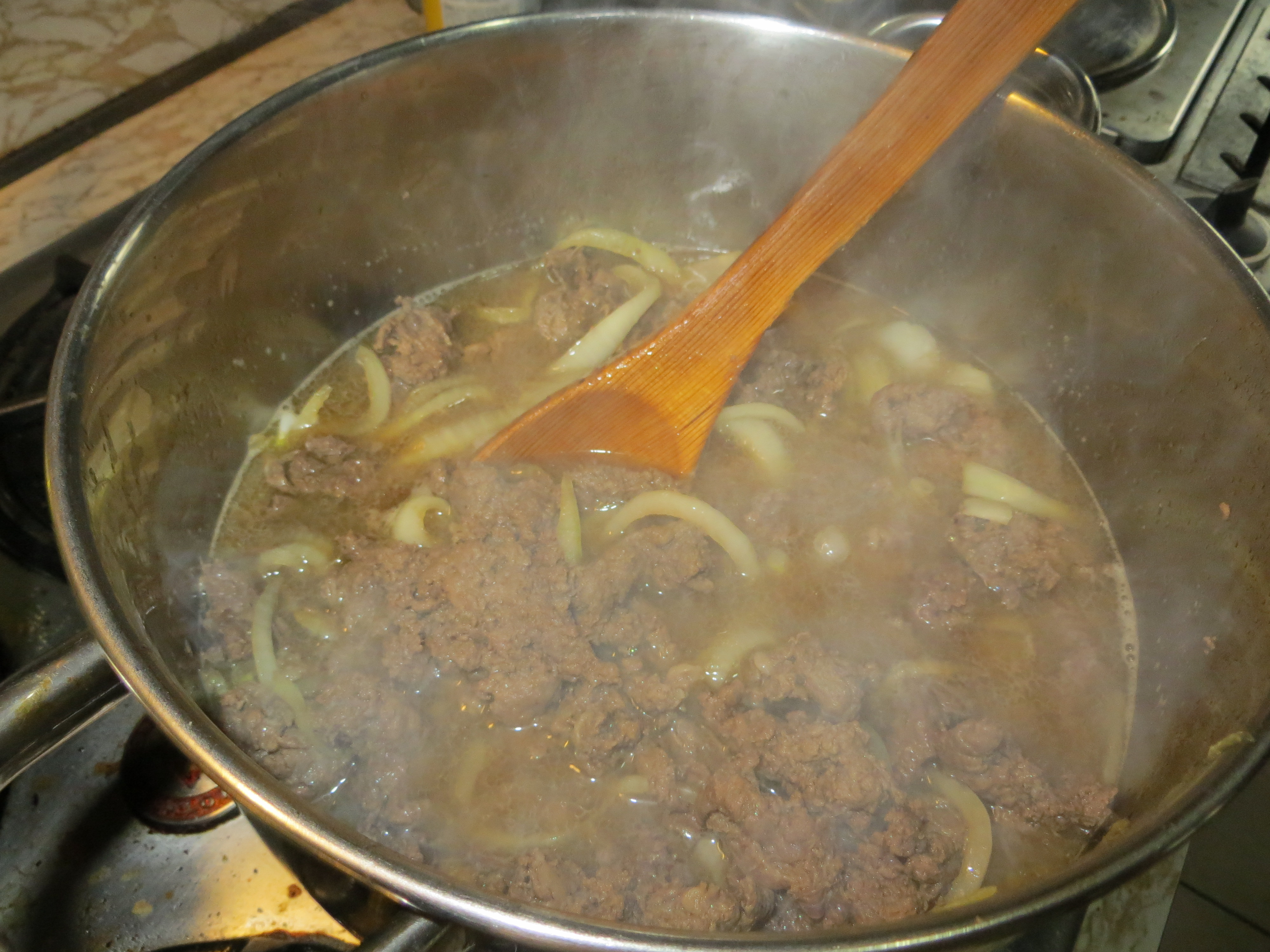 3. Set meat aside. In a medium-sized pot, saute onions in olive oil until they become translucent, but not caramelized – about ten minutes. Remove from pot and set aside.