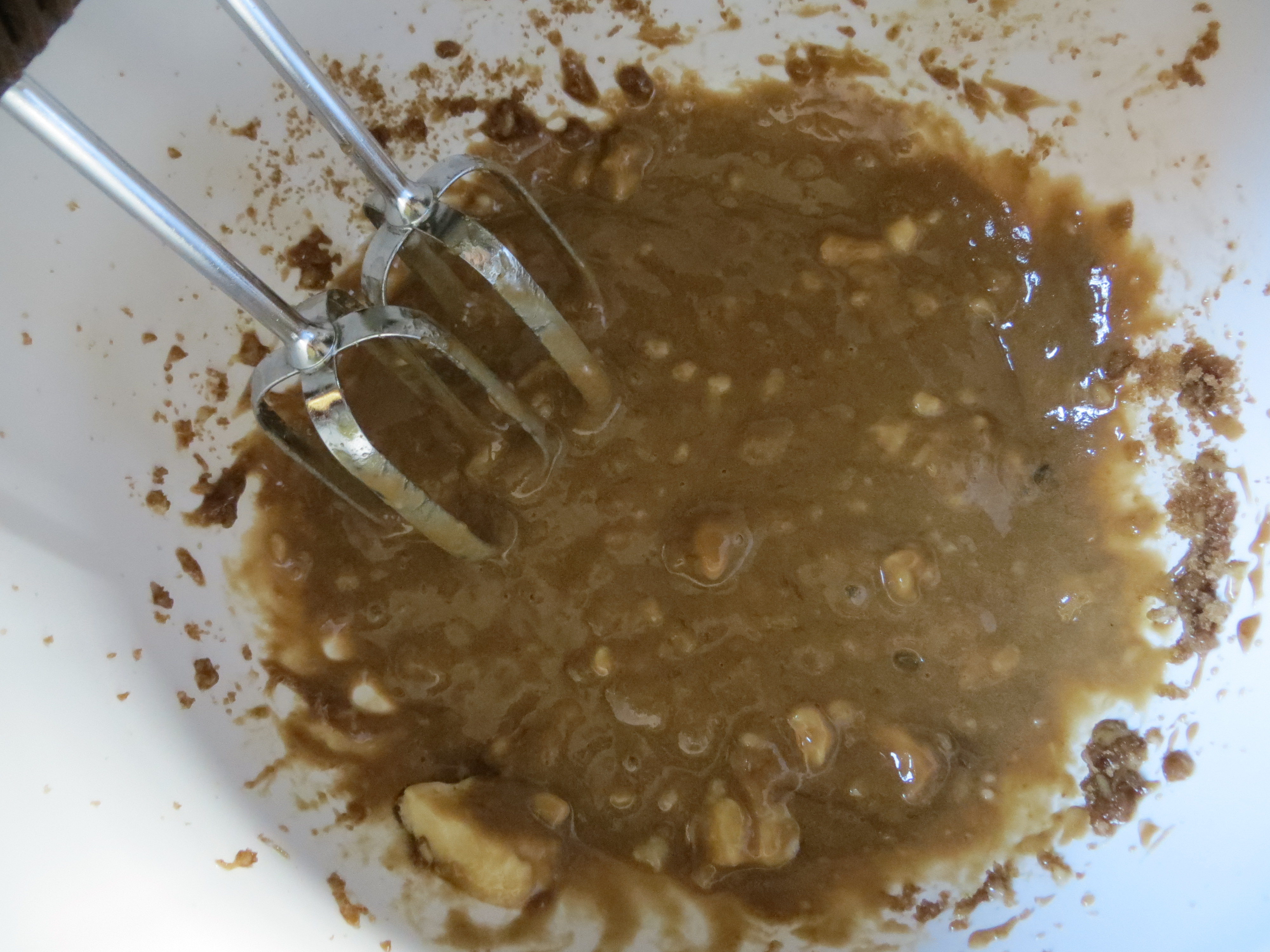 4. With an electric mixer, mix together sugar and the two remaining bananas until bananas are completed mashed — about three minutes. Scrape down sides with a rubber spatula.