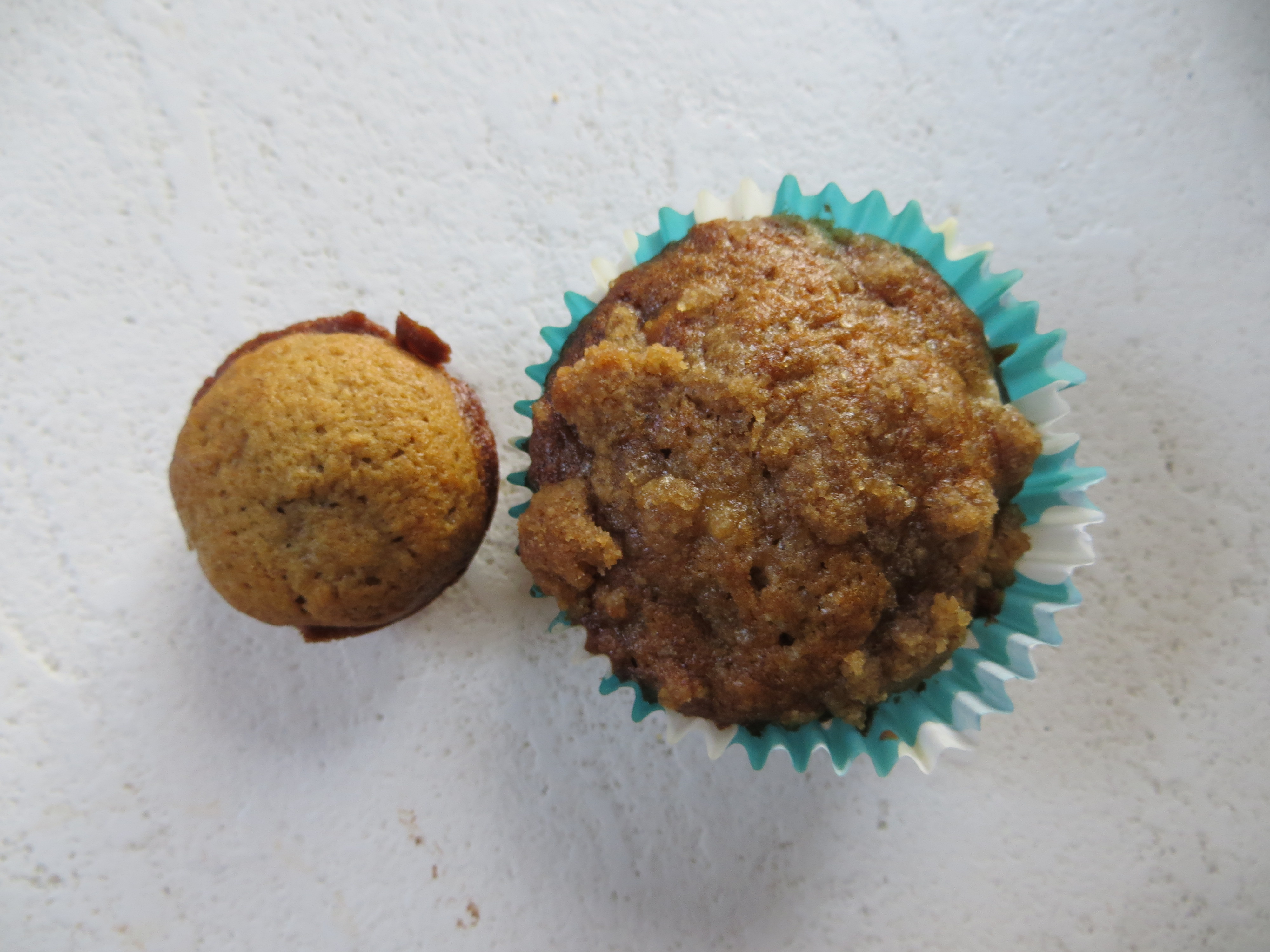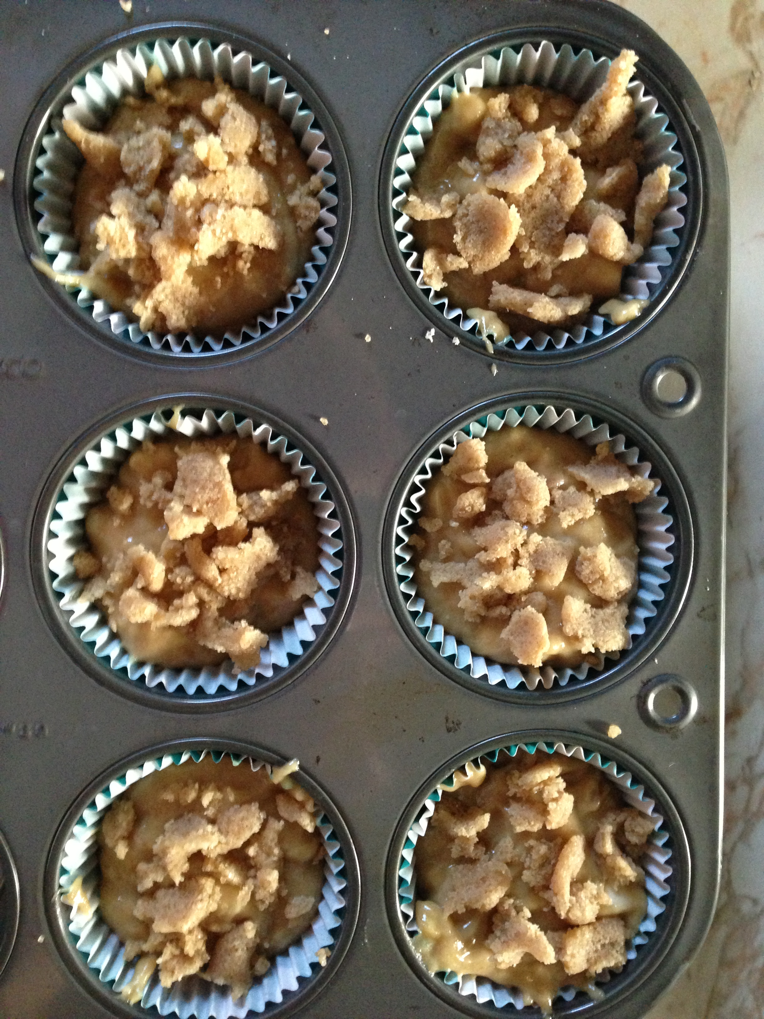 6. Spoon batter into muffin tins until about 3/4 full*. Give them a rap on the counter to get any air bubbles out. Sprinkle tops with sugar crumble (recipe follows).