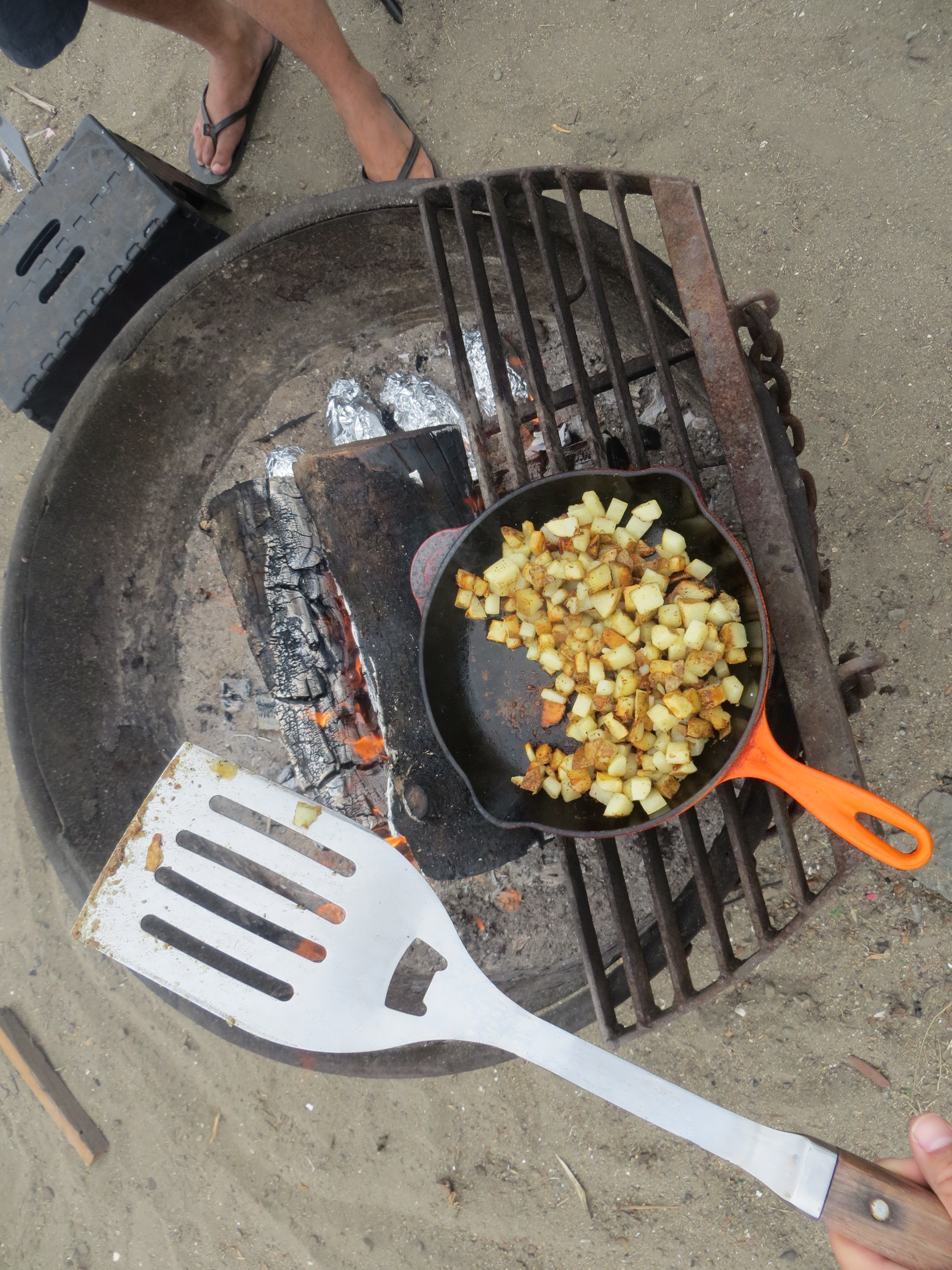 One thing I learned during this trip is that potatoes are the perfect campfire ingredient!  My brother cut some open and wrapped them in aluminum foil (a very necessary supply for car camping), and he dropped them right into the fire.  They cooked until we were almost finished with our meals, so be sure to put them in early! (Don’t worry; they won’t burn.)  I cubed some russet potatoes, drizzled a good amount of extra virgin olive oil on them and seasoned them with salt and pepper.  They went right into the skillet and onto the fire pit stove.  The nice thing about car camping is the luxury you have to BYOS (bring your own skillet).