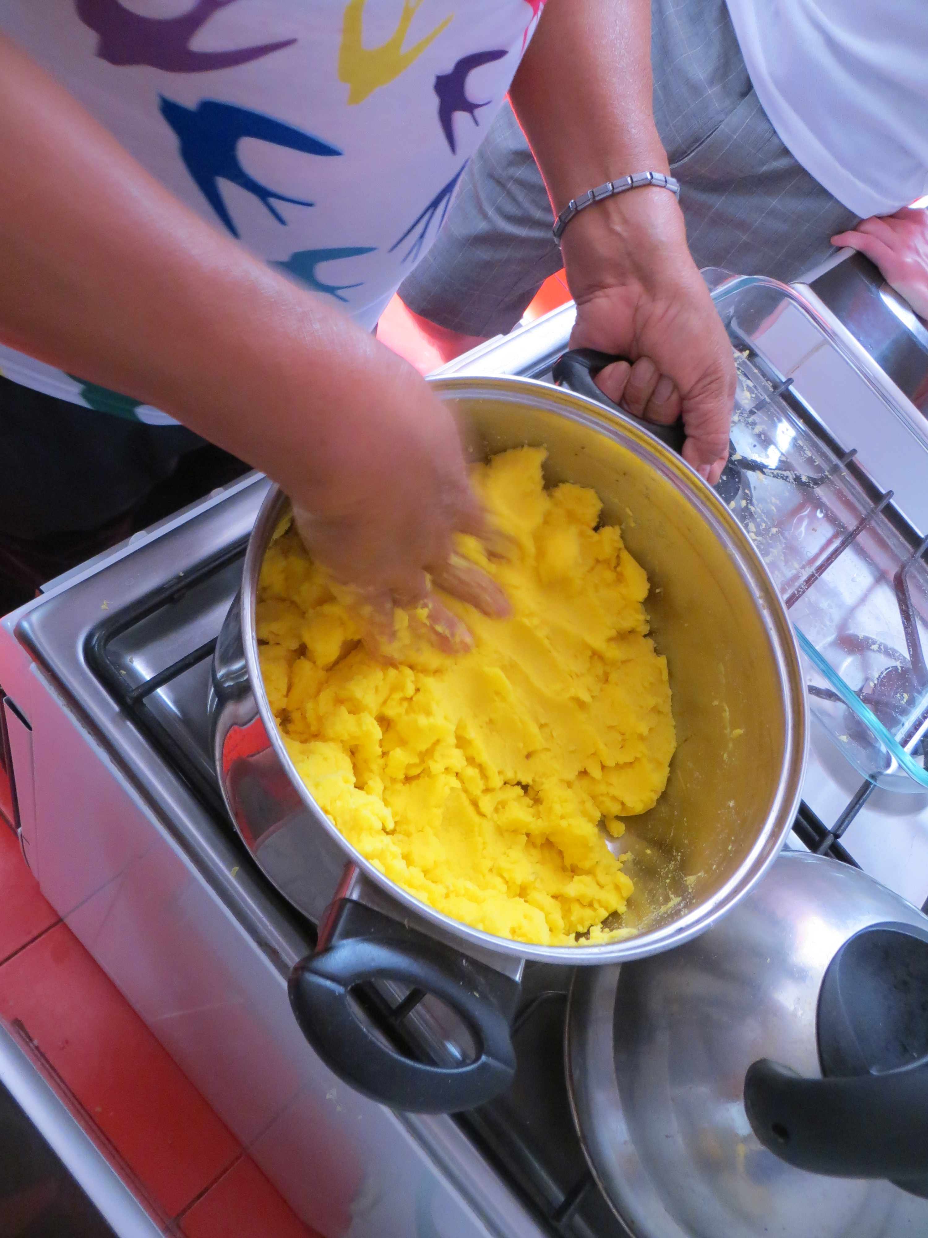 All of these dishes I had tried before at some point in my life, except for the yellow, square-shaped dish at 7 o’clock. The dish was called causa, and I knew before leaving Lima, I had to know how to make it. I was chatting with the owner of our house, mi amiga, Ivonne. She told me that our house señora, Marisa, would be able to teach it to me! Wow! I hadn’t shared much conversation with Marisa since arriving at the casa. Her Spanish is muy rapido for me to understand, and she doesn’t speak English at all. This cooking lesson would be very interesting, I thought. Another friend, Robert, joined our lesson as well, and since his Spanish is very good, he was a translator for Marisa and me whenever hand gestures didn’t suffice.