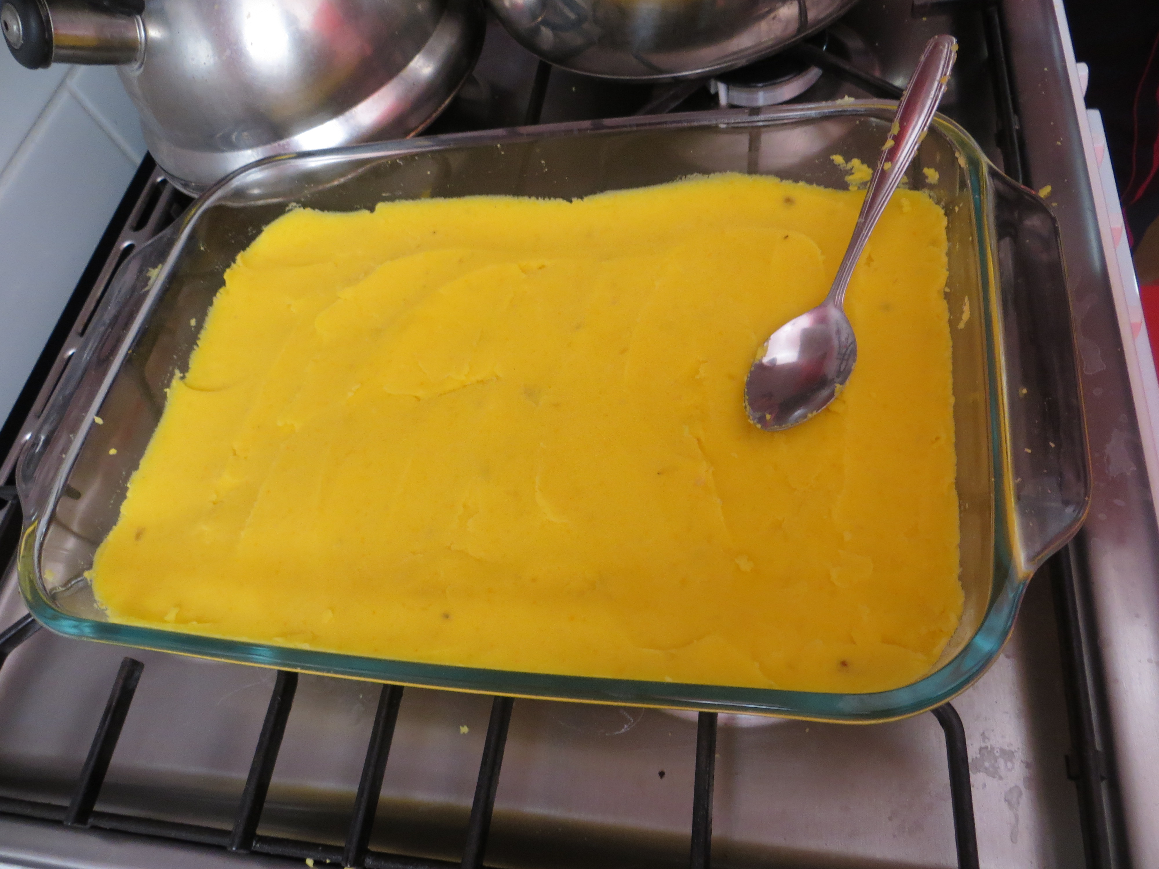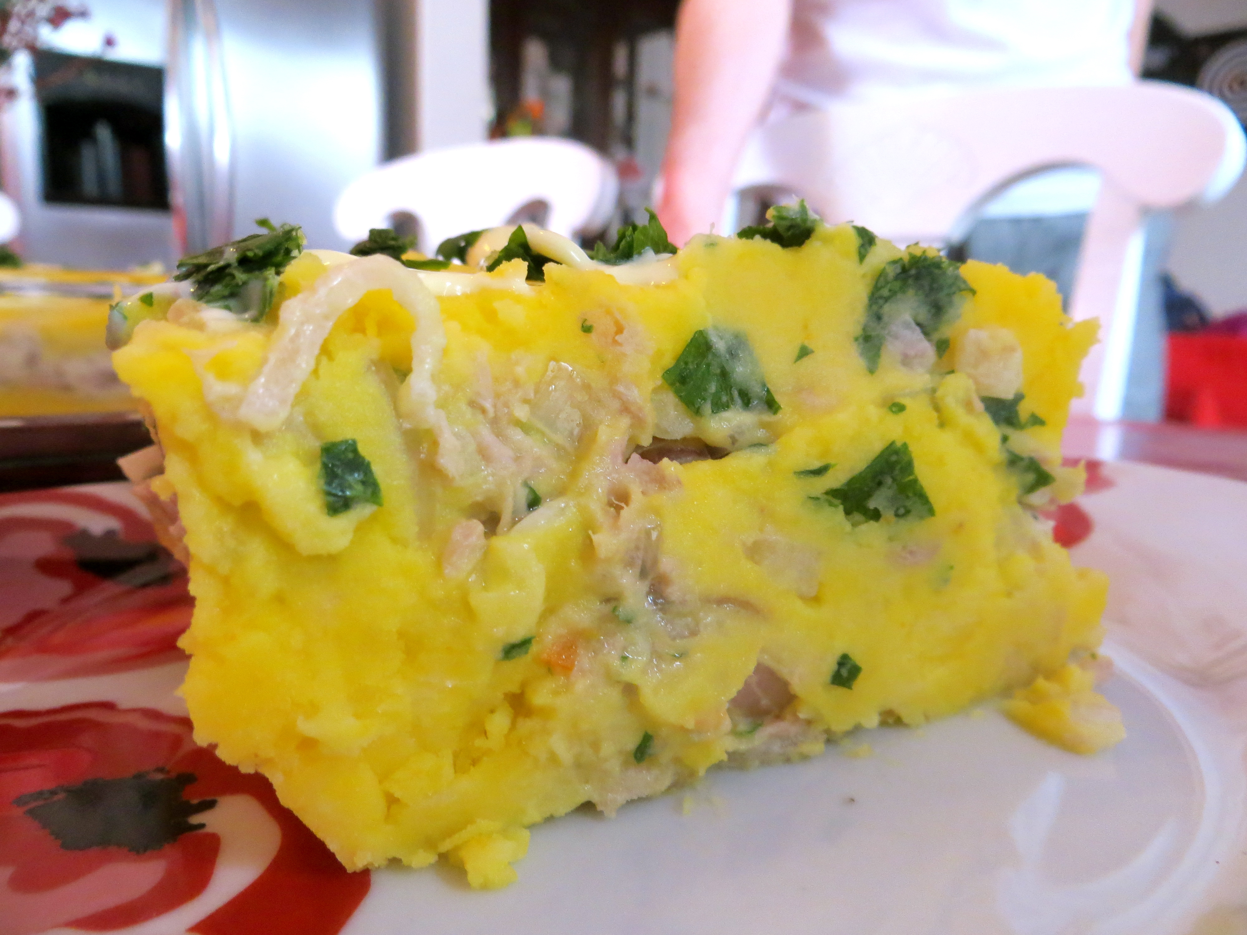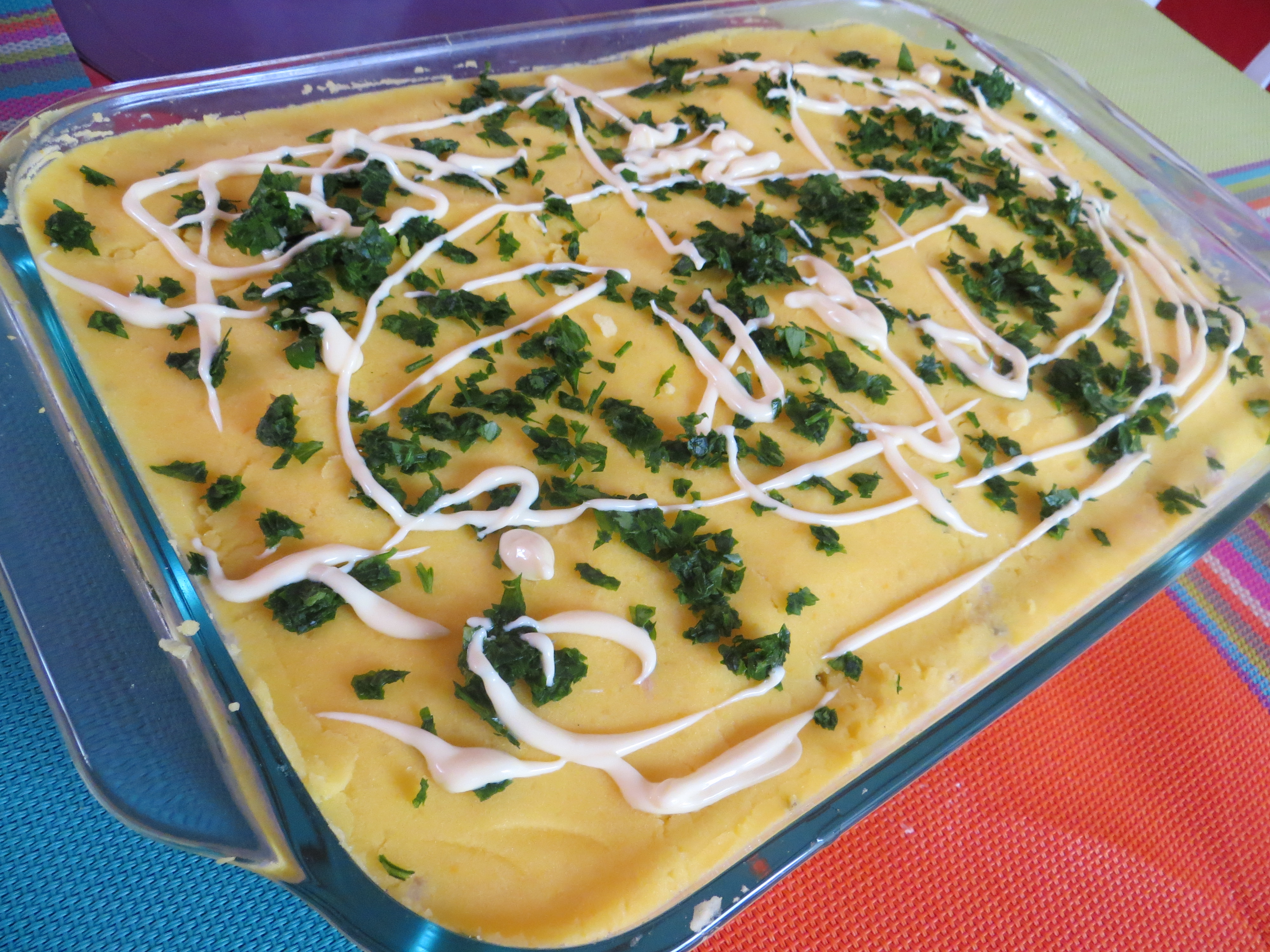 When everything is ready to assemble, flatten half of the potato mixture onto the bottom of the casserole dish. Evenly spread the tuna mixture over the first layer of the aji potato mixture. Top with the rest of the aji potatoes and spread evenly.